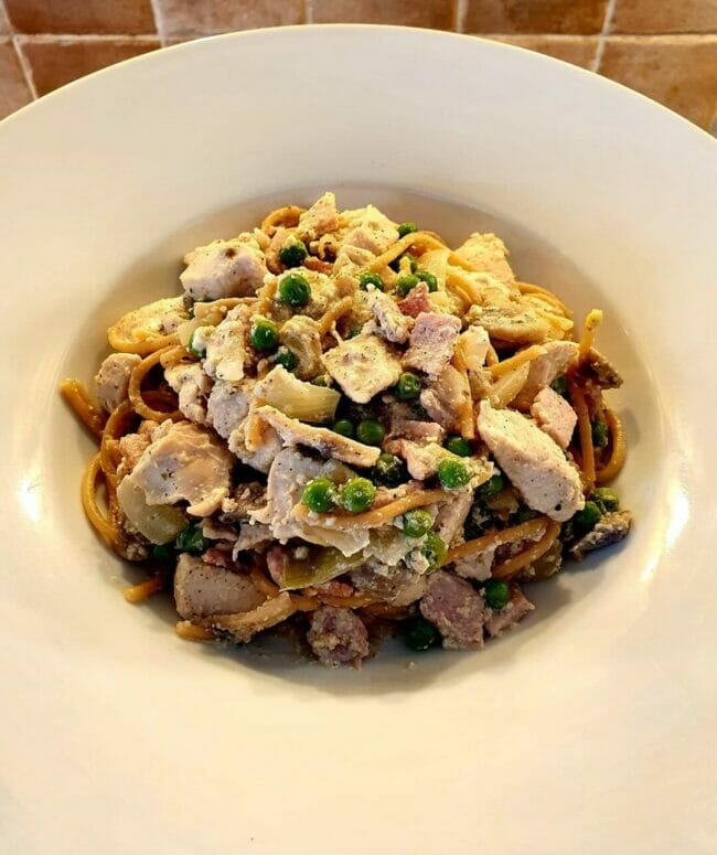 Hard to beat a good pasta dish. This is a lighter take on a carbonara which can often be very high in calories and saturated fat. This version also includes some veggies.